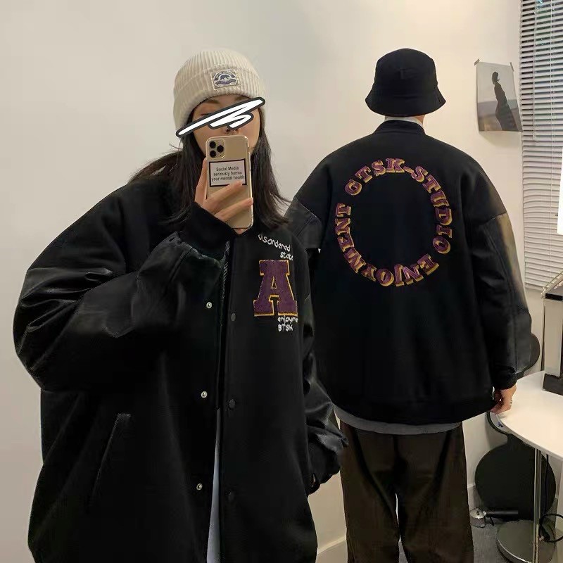 ÁO BOMBER KAKI TAY PHỐI DA CHỮ THÊU VÒNG TRÒN SAU FROM UNISEX NAM NỮ STYLE ULZZANG free ship
